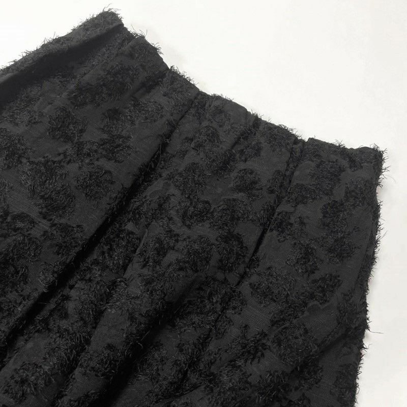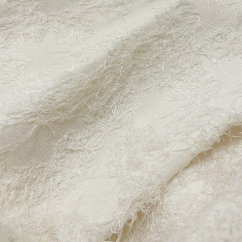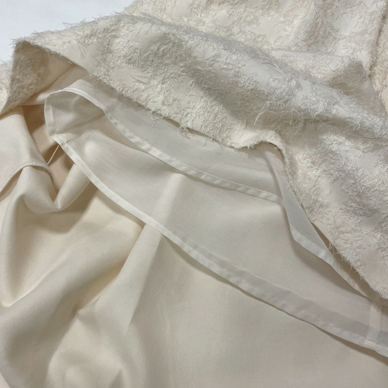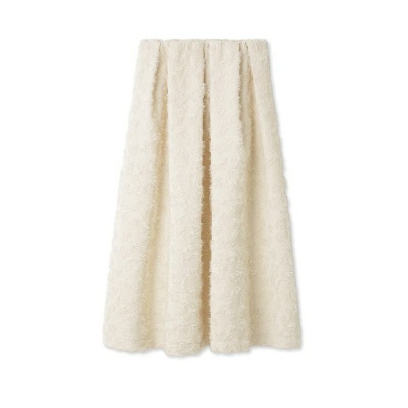 表情豊かなジャガードがユニークなフレアスカート。表面に凹凸のある毛足の長いジャガードは存在感があるため、ボリュームを持たせながらも、腰まわりからミドルヒップラインはすっきりと。女性らしいシルエットに仕上がっています。