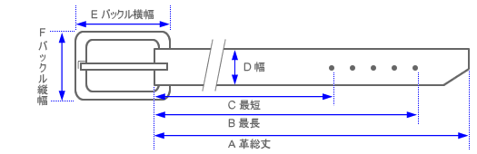 バックルから一番遠い調節穴の端までの、革部分の長さです。C 最短