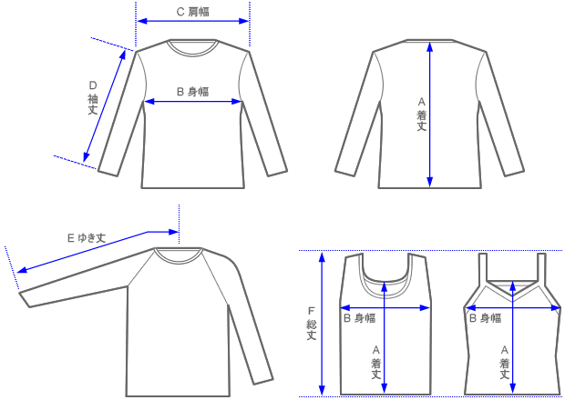 タンクトップやキャミソールなど、肩口の最上部から裾口までの長さです。パンツの測り方